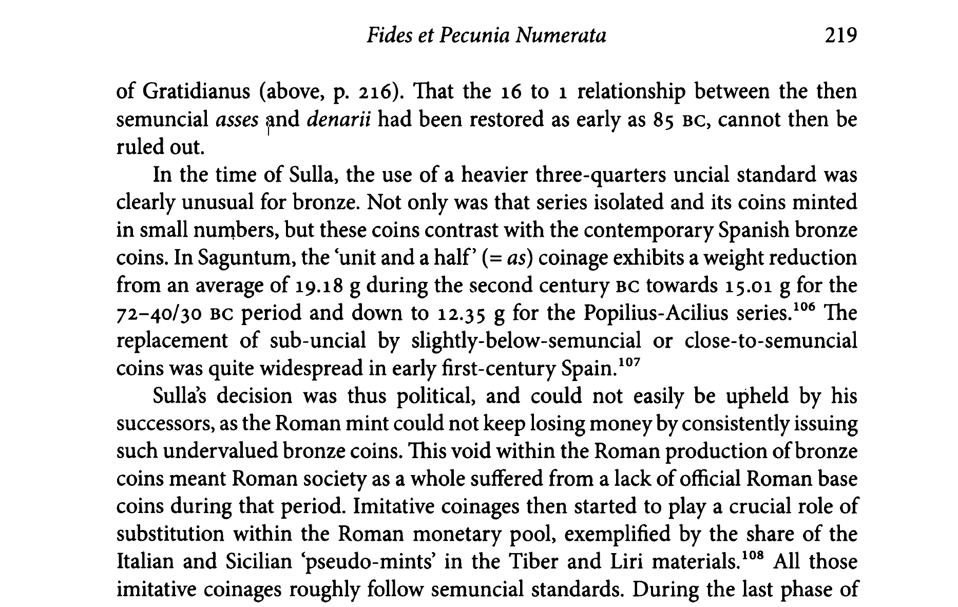 “The norm of 84 denarii per libra was not fundamentally abandoned, but remained (ideally) valid until the late Roman period. However, certain fluctuation margins could have been decreed, and more important: the compulsion to accept coins as soon as they were declared authentic. This was not a general decoupling of weight and value, but a step in this direction. Since Gratidianus’ edict, the Roman coin was essentially something different from what it had been up to then.”
