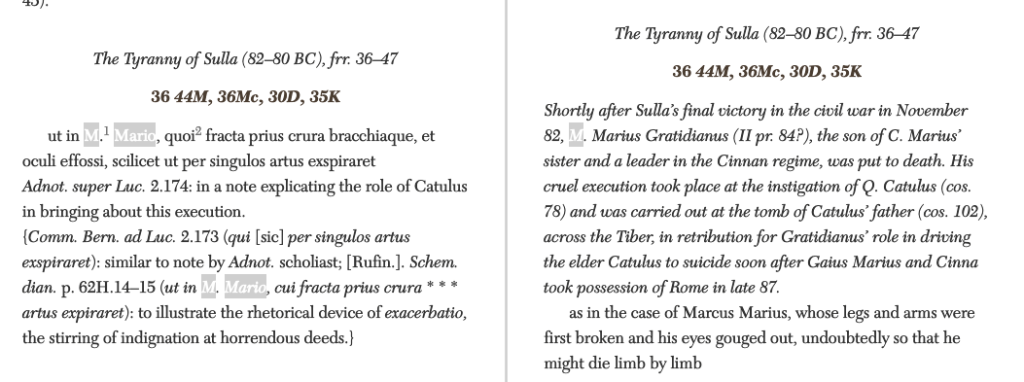 Ascon. Cic. Tog. Cand. 89C-90C (80): [quoting from Cicero’s original speech] “From the plebs? To whom your brutality presented a spectacle such that no one can set eyes upon you without a groan and a remembrance of sorrow?” [end quote] He cast in his teeth the reproach of having brandished the head of that same Marius Gratidianus.
