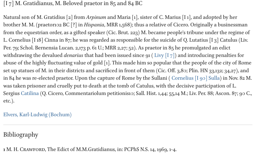 Cic. Off. 3.80: Even our kinsman Gratidianus failed on one occasion to perform what would be a good man’s duty: in his praetorship the tribunes of the people summoned the college of praetors to council, in order to adopt by joint resolution a standard of value for our currency; for at that time the value of money was so fluctuating that no one could tell how much he was worth. In joint session they drafted an ordinance, defining the penalty and the method of procedure in cases of violation of the ordinance, and agreed that they should all appear together upon the rostra in the afternoon to publish it. And while all the rest withdrew, some in one direction, some in another, Marius (Gratidianus) went straight from the council-chamber to the rostra and published individually what had been drawn up by all together. And that coup, if you care to know, brought him vast honour; in every street statues of him were erected; before these incense and candles burned. In a word, no one ever enjoyed greater popularity with the masses. (Loeb trans.)