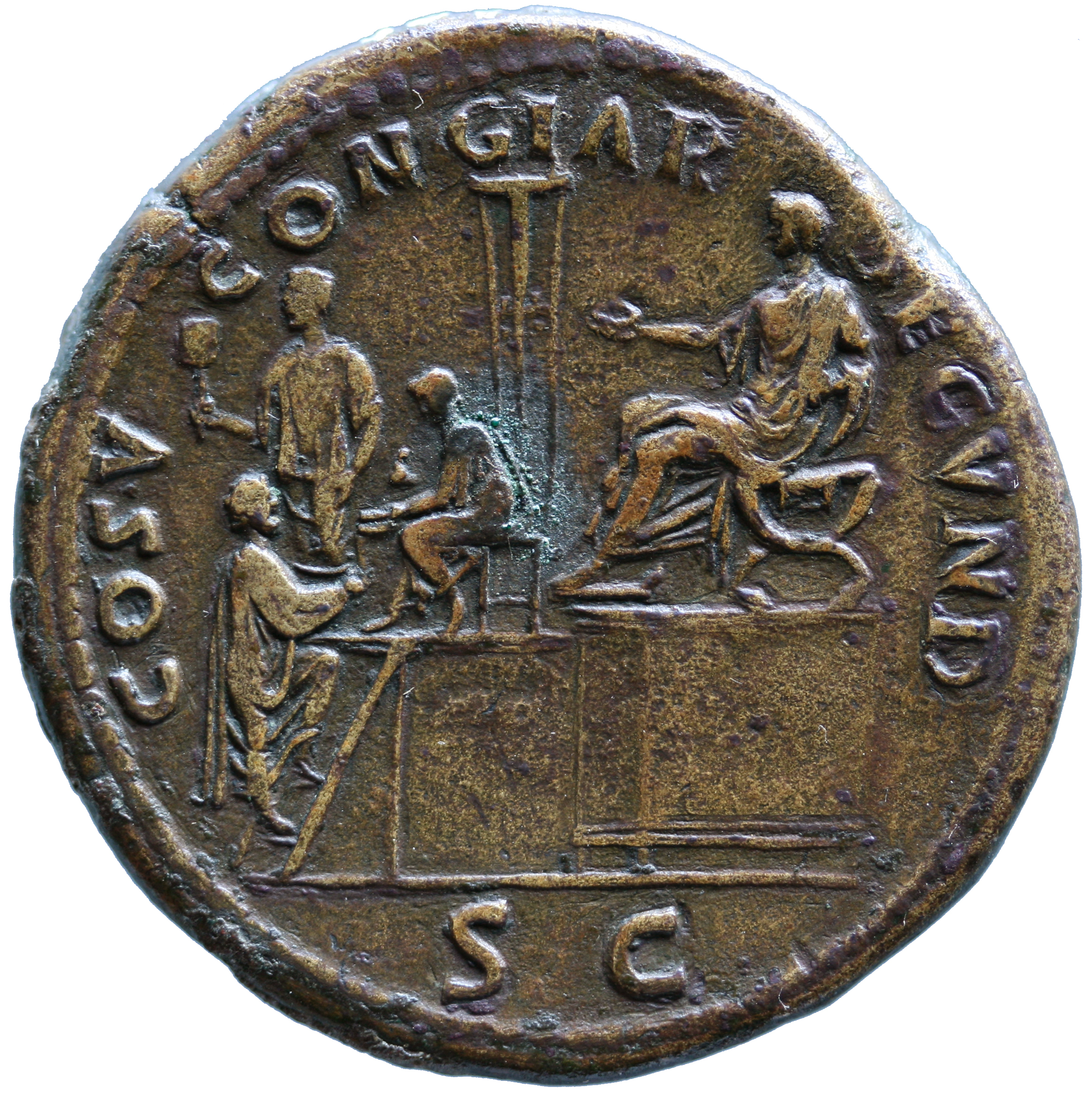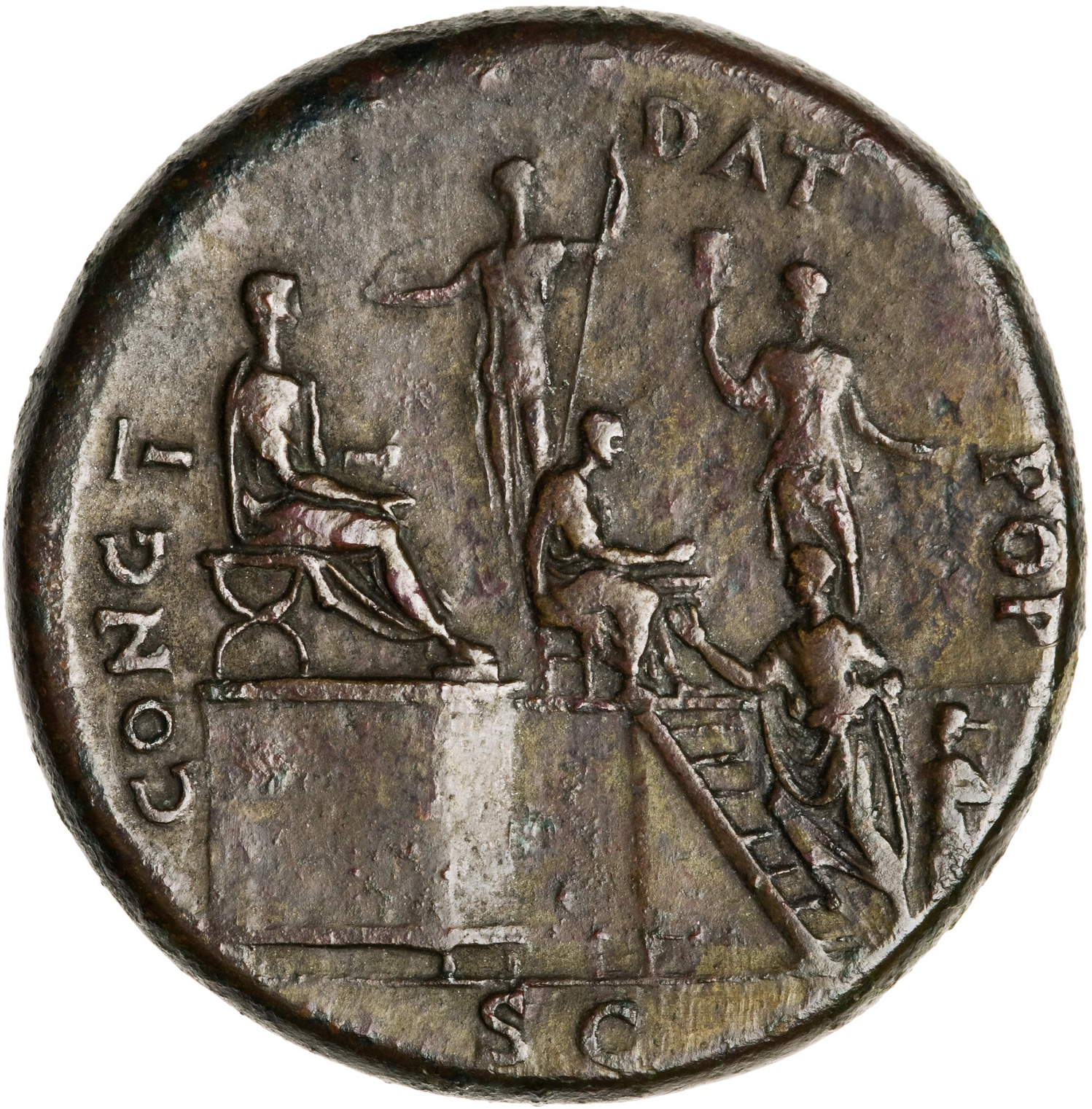 ANS Specimen: “CONG I DAT POP S C – Nero, bare-headed and togate, seated right, on platform, left; official seated right on another platform extending congiarium to citizen with small boy behind him; Minerva, head left, holding owl and spear, and Liberalitas on right, holding tessera”