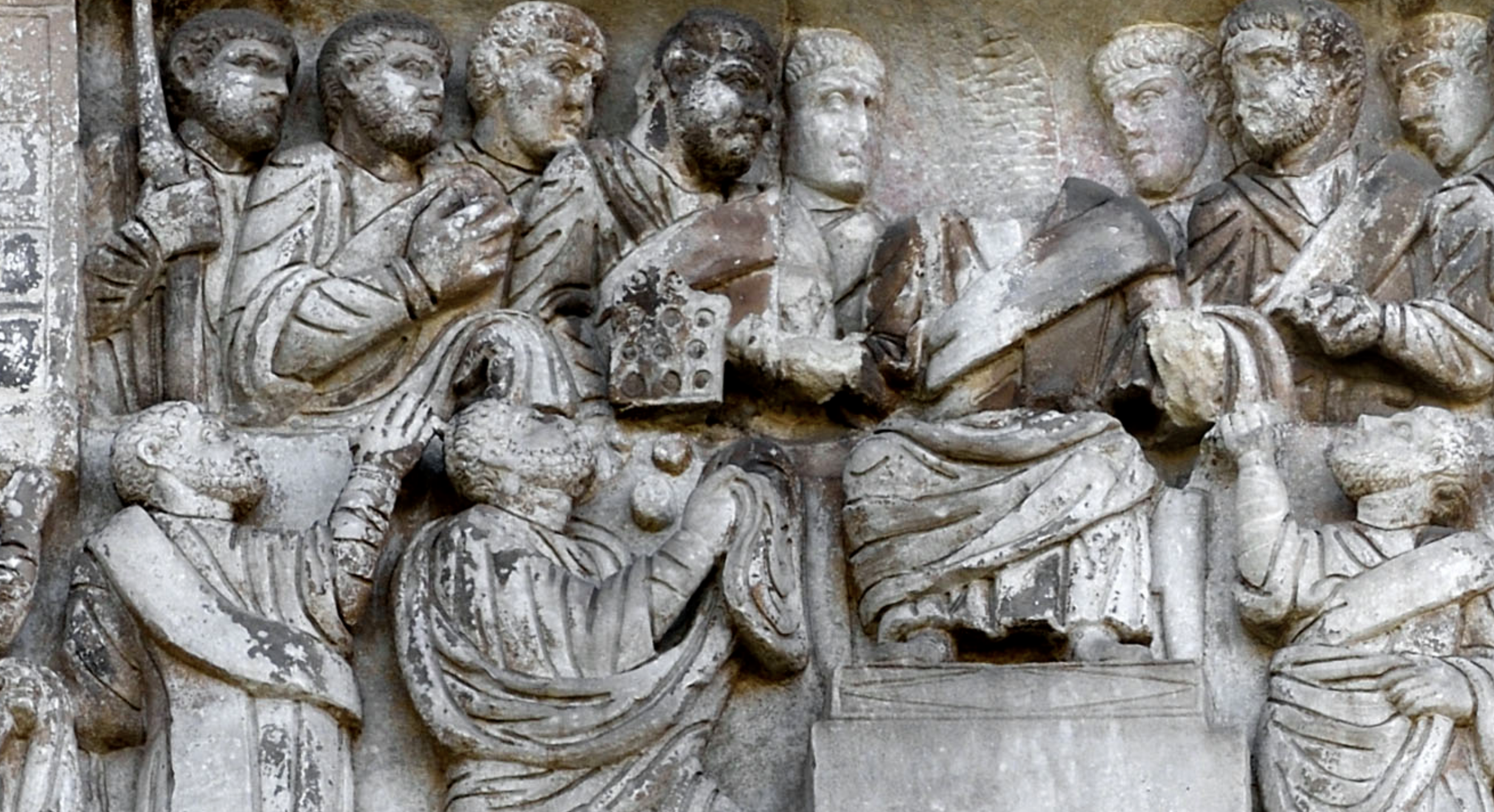 “Constantine and his attendants distributing largess to the Roman people (largitio). Relief of the frieze on the eastern side (Constantinian frieze). Marble. 312—315 CE.” © 2017. Photo: Ilya Shurygin. (Source)