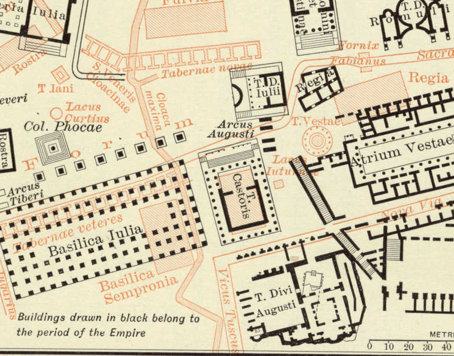 The topography of A. Sempronius Asellio‘s death (89 BCE) confused me. Where were the shops between the temple of Castor and the Vestals? The distance is very short, 50 meters or so and there was the lacus Juturna there. Could the text mean that he turned and ran all the way back to the tabernae veteres in front of the Basilica Sempronia? Would not going up into the temple of Castor have been a better place to seek sanctuary? But the course of action need not be logical. There have been many excavations in and around the Temple of Castor in recent years. I wonder if they might shed light on where Asellio might have fled. I also wonder if the mob that attacked him might not have been bankers and money changers working in the same area who made an opportunistic attack when the Praetor was in their vicinity.