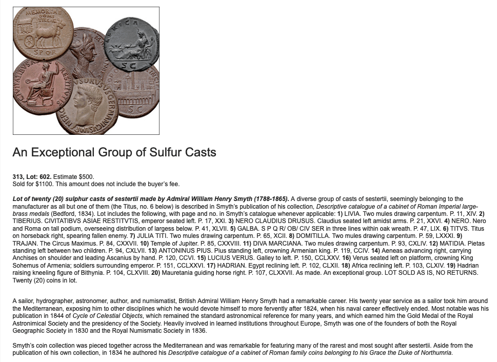 These are described in the catalogue entries (L491 and L492) as casts of Roman imperial coins in sulfur. At first I was suspicious that something so pretty could be a cast…