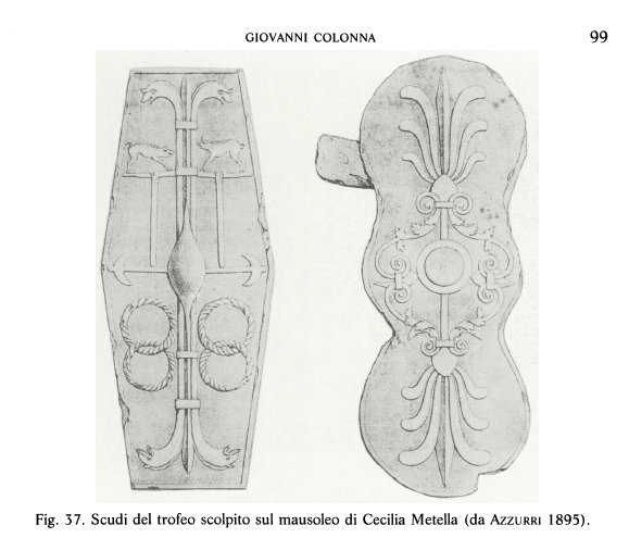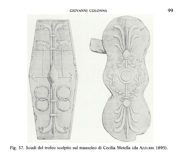 Colonna, Giovanni. “Gli scudi bilobati dell’Italia centrale e l’ancile dei Salii.” Archeologia classica 43 (1991): 55-122. It is gloriously illustrated. JSTOR link