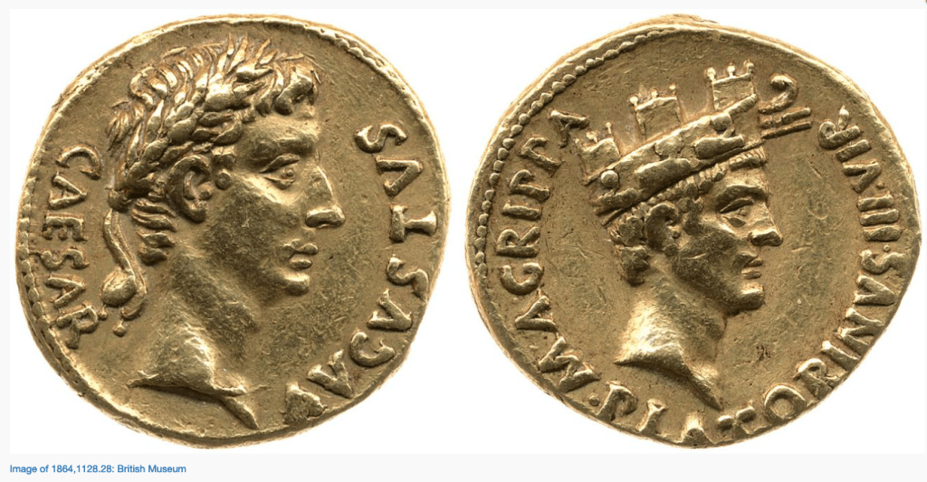 Agrippa is seen on many early Augustan coins with very funny head gear: