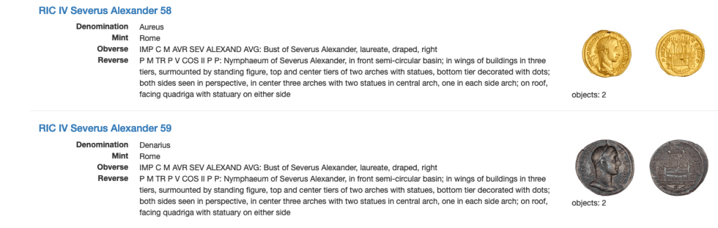 So on the Bronze coins this structure of Severus is always called a Thermae BUT on the gold and silver coins a Nymphaeum