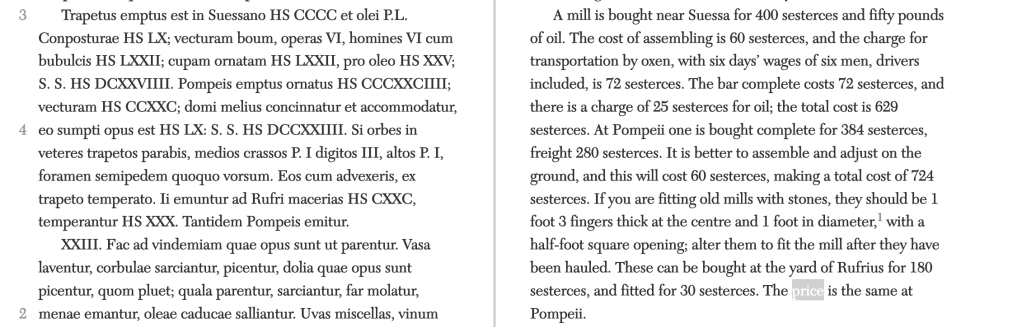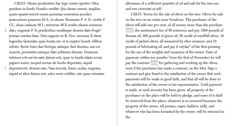 Note that the manuscript gives SS as the until for what the auctioneer will be paid 50 of. This translator renders that sestertii, but this text must be before 149 BCE. A period in which we tend to think of the unit of account being asses. The passage below is more clear using the more standard HS but in one place with SS. Something to think about another day.