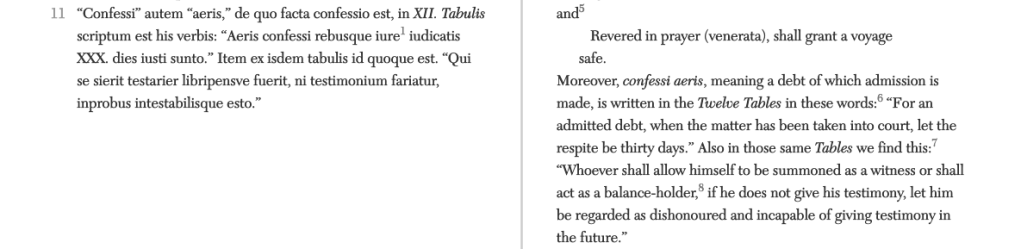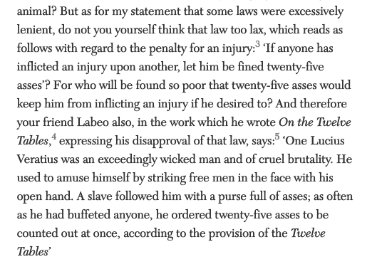 In Aulus Gellius’ Attic Nights (16.10) there is a long disquisition on the meaning of old words based on a line of Ennius that calls in as evidence the XII tables. The main concern is what does proletarii mean as compared to capite censi. It is a good read all on its own. But the part that is of interest is in the list of out dated legal jargon occurs the phrase: ‘twenty-five asses’ viginti quinque asses, but it is commonly said the XII give no units to their multiple fines. What is meant here then?