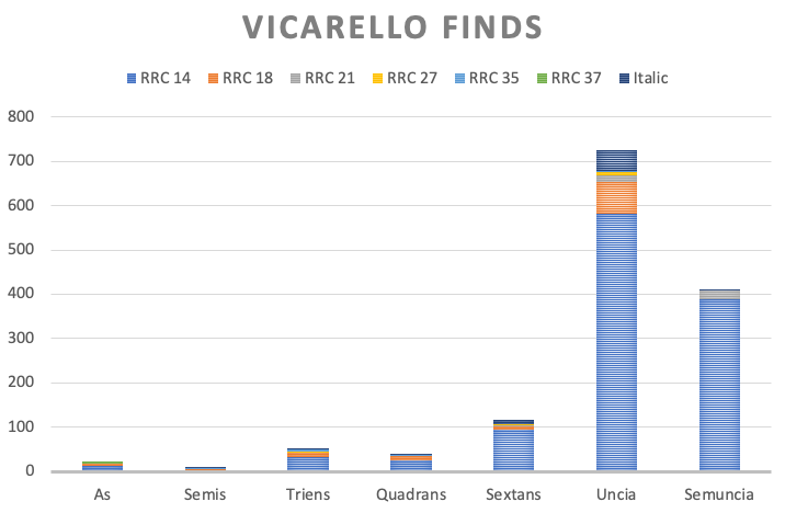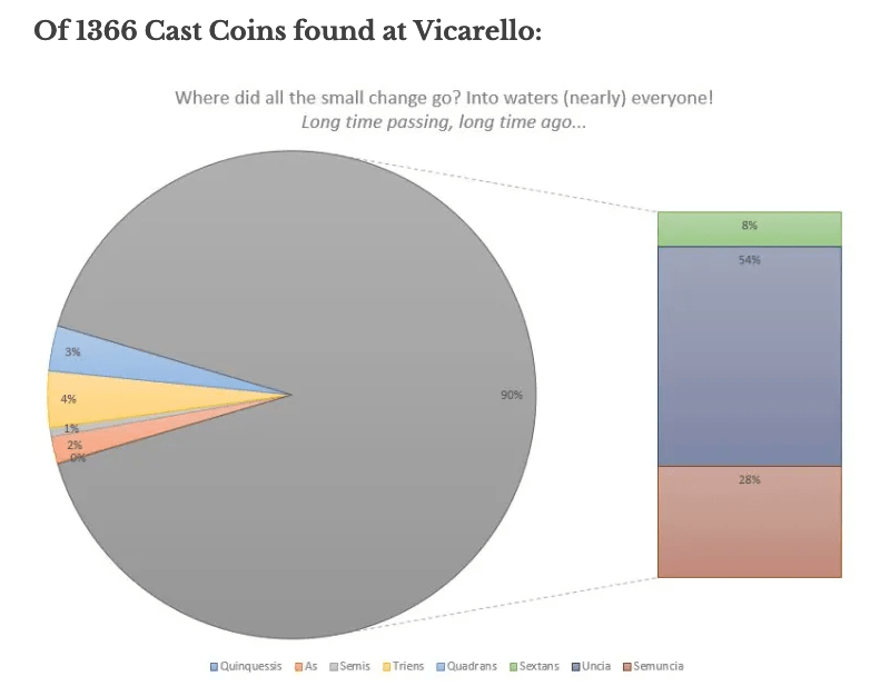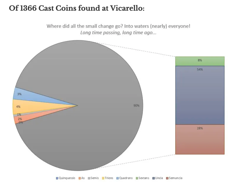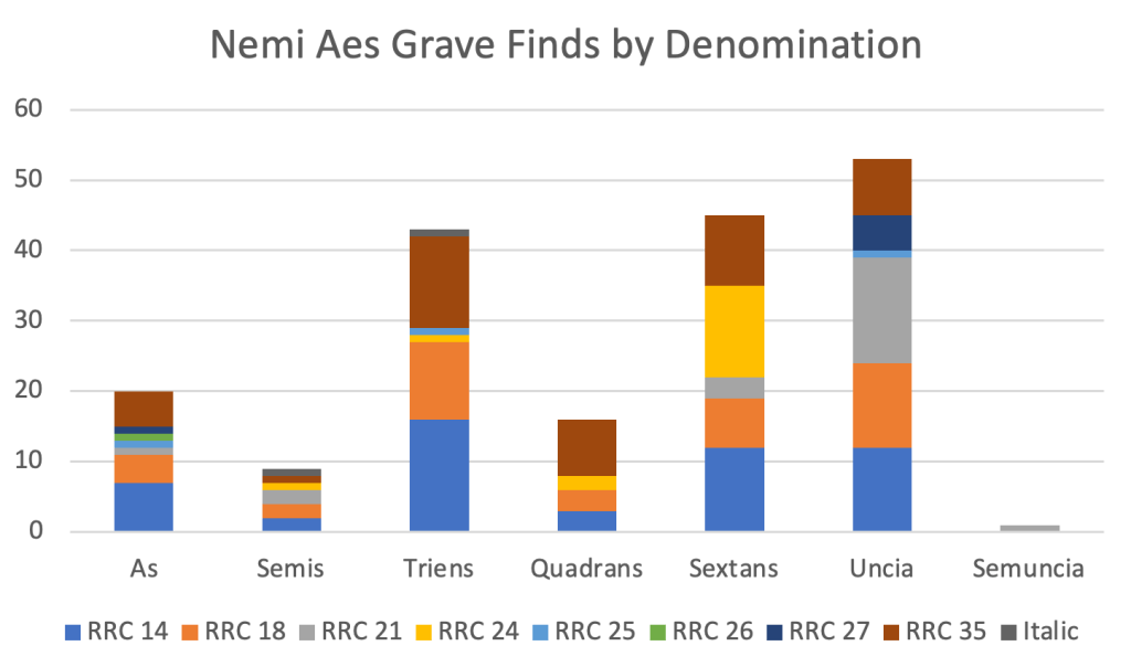 My sense has been that unciae are popular as small votives and out number other denominations among the finds, but I hadn’t actually quantified this until today: