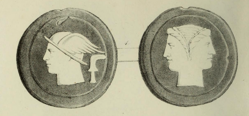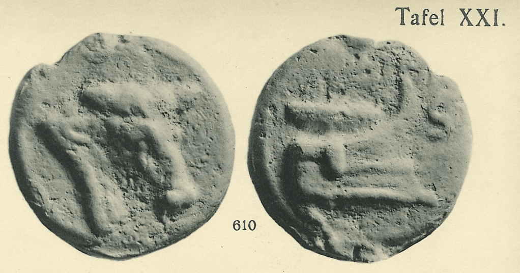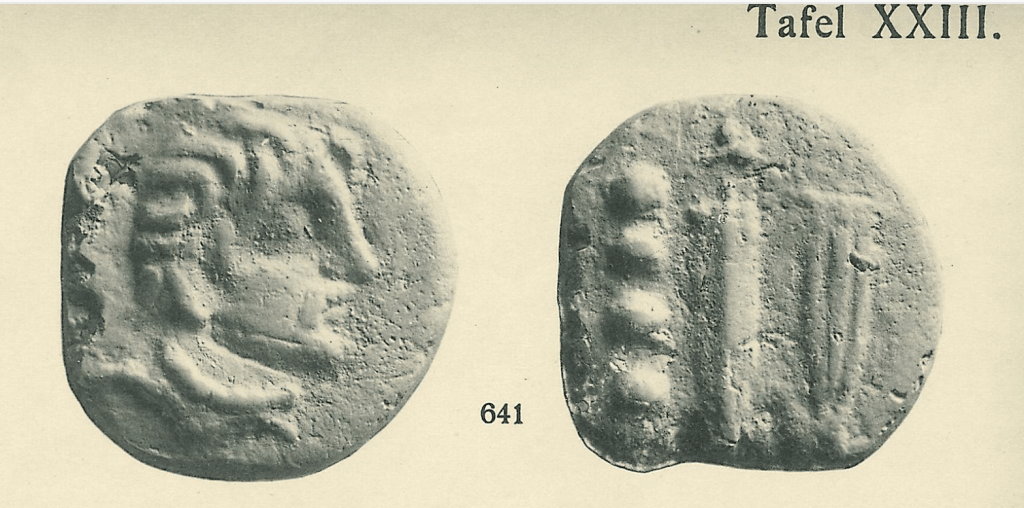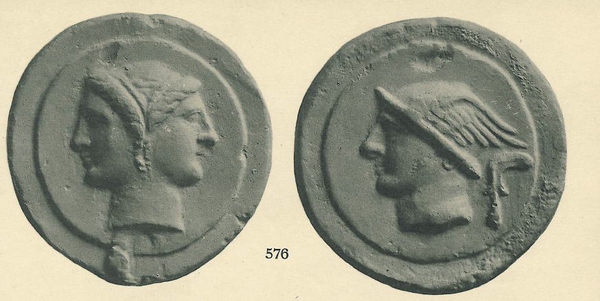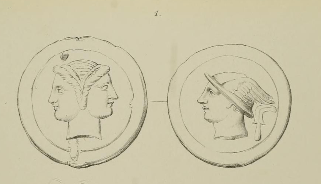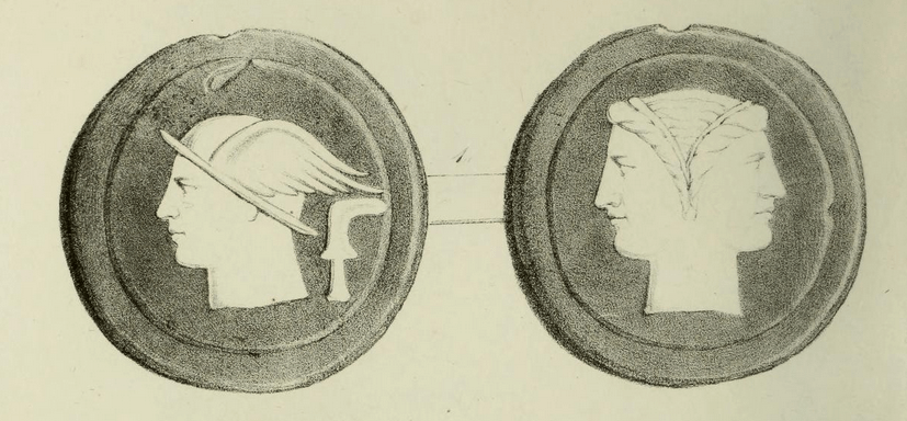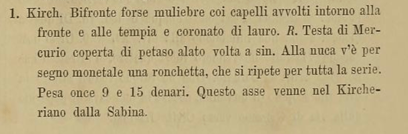 This is Marchi’s illustration of the same coin from 1839. It marks the tell tale void above Mercury’s head and the unique shape of the wing on the helmet. Also on the Janus side the nick at the top and then the cut on the right side of inner rim also match. Although Marchi’s catalogue is officially of specimens from the Kircher collection, we know that some of the specimens he illustrates were later found in other museums, cf. the Ariminum coin discussed above and also from that same series the whole unit, known to Garrucci to be in Pesaro and also found there and documented by cast and photography by Haeberlin, and already known in 1767 in the collection of Passerii.