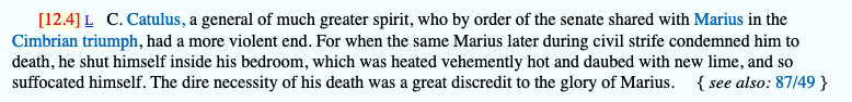 Cic. Tusc. 5.56: Was not Marius happier, I pray you, when he shared the glory of the victory gained over the Cimbrians with his colleague Catulus (who was almost another Laelius, for I look upon the two men as very like one another,) than when, conqueror in the civil war, he in a passion answered the friends of Catulus, who were interceding for him, “Let him die” ? And this answer he gave, not once only, but often. But in such a case, he was happier who submitted to that barbarous decree than he who issued it. And it is better to receive an injury than to do one; and so it was better to advance a little to meet that death that was making its approaches, as Catulus did, than, like Marius, to sully the glory of six consulships, and disgrace his latter days, by the death of such a man.