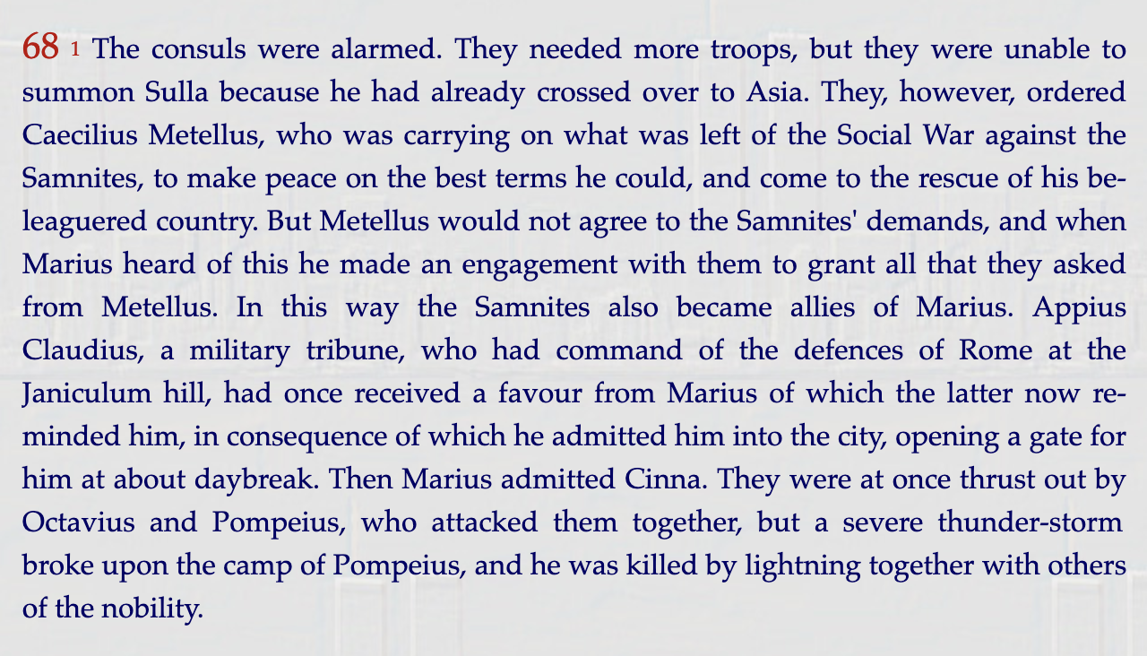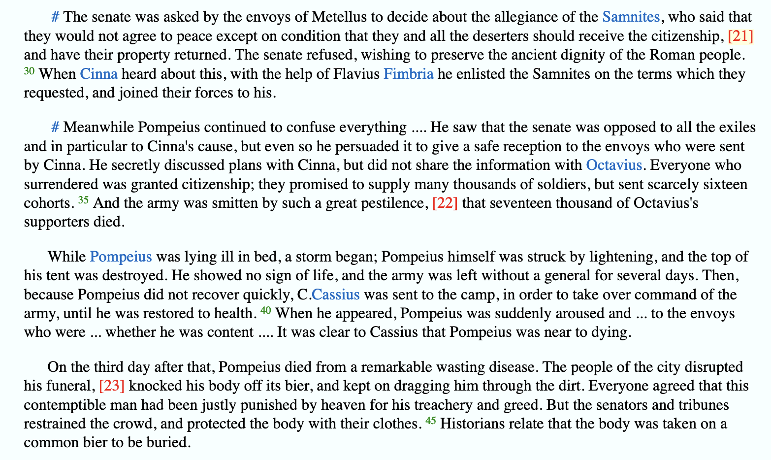 Shortly after this battle, while pestilence was ravaging both armies, as though their strength had not been sapped enough by the war, Gnaeus Pompeius died. The joy felt at his death almost counterbalanced the feeling of loss for the citizens who had perished by sword or pestilence, and the Roman people vented upon his dead body the hatred it had owed him while he lived