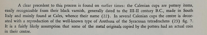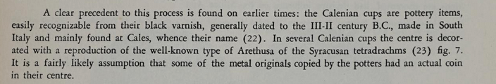 I find this very exciting because I’ve argued elsewhere for a close relationship between the stamped black glaze pottery (vernice nera with petites estampilles) and numismatic images. I think that the potter actually press the coin into the mold and then used that mold to make these cups.