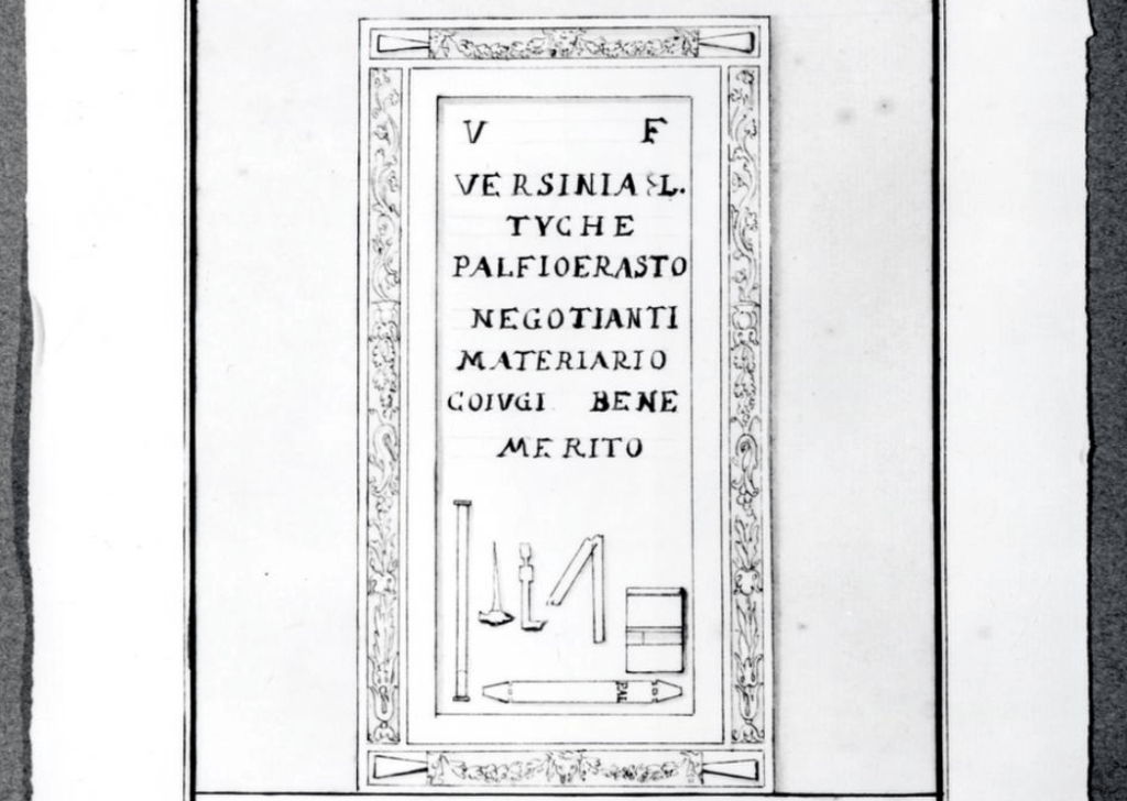 “Versinia Tyche, freedwoman and wife, during her lifetime, erected this monument for the timber merchant for Publius Alfius Erastus, a meritorious spouse”
