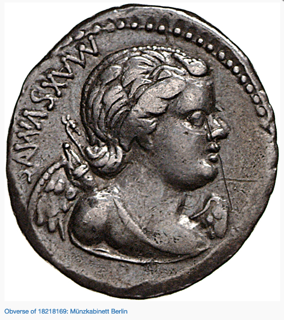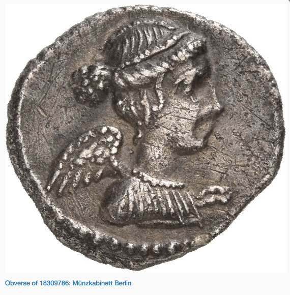 While most of the Victories with nodi hairstyles on the Republican series are thought to be portraits in the guise of important women (usually Fulvia; see below), arguably the first with a nodus was struck by P·SEPVLLIVS MACER in 44 BCE (RRC 480/25)