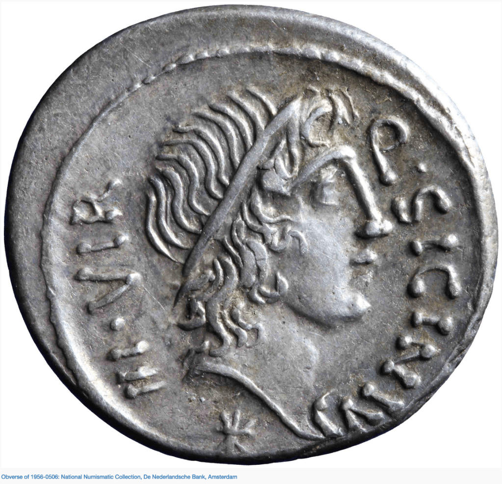 Weirdly it is an SC issue. This means, we think, that it was issued in addition to any authorization to coin money in the regular course of the year (What I think SC means and why). What does it mean to have striking authorized by SC but presumably no other senatorial authorization for the year? I’m interested in these authorizations of funding and the connection for the coinage also because in 51 BCE Cicero seems to be waiting for his own funding authorization (A.5.4: 12 May 51).