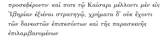 once when Caesar was on the point of setting out for Spain as praetor, and had no money, and his creditors descended upon him and began to attach his outfit,Crassus did not leave him in the lurch, but stood surety himself for eight hundred and thirty talents.