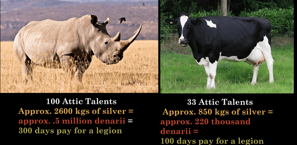 Imagine the weight of 8 full grown male rhinos and a one young skinny cow. That’s how much Crassus got hold over Caesar by way of other creditors. Or, if that is too silly for you enough to pay a legion for over 8 years. It makes me wonder if Crassus gave up the triumph to stand for the consulship because he’d not made enough in Spain to cover the debts and he needed a new province to get out from under Crassus’ thumb… Rabid speculation. Don’t quote me. I’d have to think a great deal more about this.