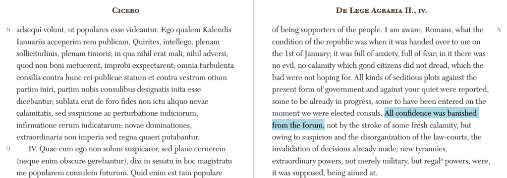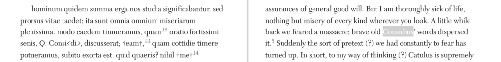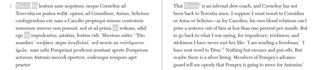 S-B doesn’t think Teucris is Antony himself but rather a female agent based on the use of illa. The question is whether Cicero will defend Antony at his trial and if this loan is a quid pro quo arrangement. Antony may be holding out on dispensing the loan because of Cicero’s hesitations on the defense. Cicero wants a good interest rate. 12% per annum (= 1% per month) is an acceptable business rate as we’ve seen from this being the cap in Cicero’s edict. Cicero wants mates’ rates and Antony doesn’t want to deliver without re assurances of them actually being mates! Again I’m not sure this can be used as evidence as Gruen does here. I read the difficulty with the loan being a personal matter not a state of the economy matter.
