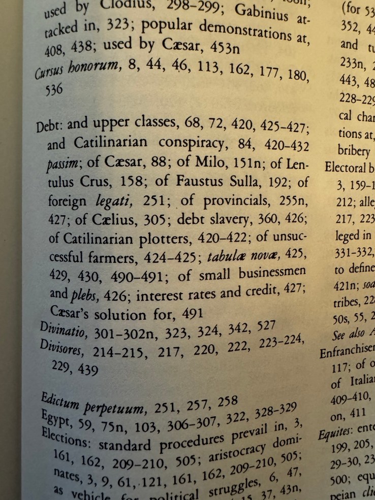So the conference for which I’ve been preparing is to mark the 50th anniversary of Gruen’s Last Generation of Roman Republic. Thus in preperation I need to re familiarize my self with his thoughts on Debt. The fantastic thing about 50 year old indices is that they are USEFUL. This is in stark contrast with many today that are at once created by text searching and also assume that you can probably just search the electronic version of the book yourself.