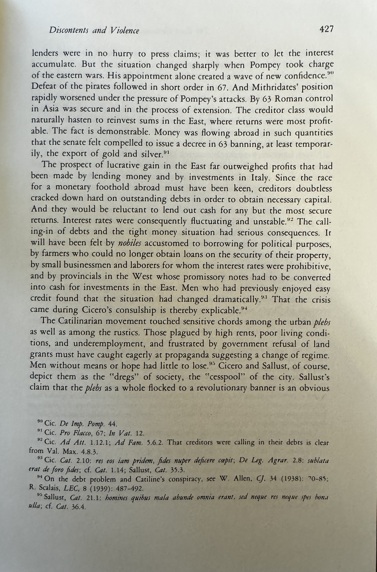 P. 68 – Reviews power of Crassus uses as examples his role in Catilinarian conspiracy and Clodius and Cicero both wanting his support after.