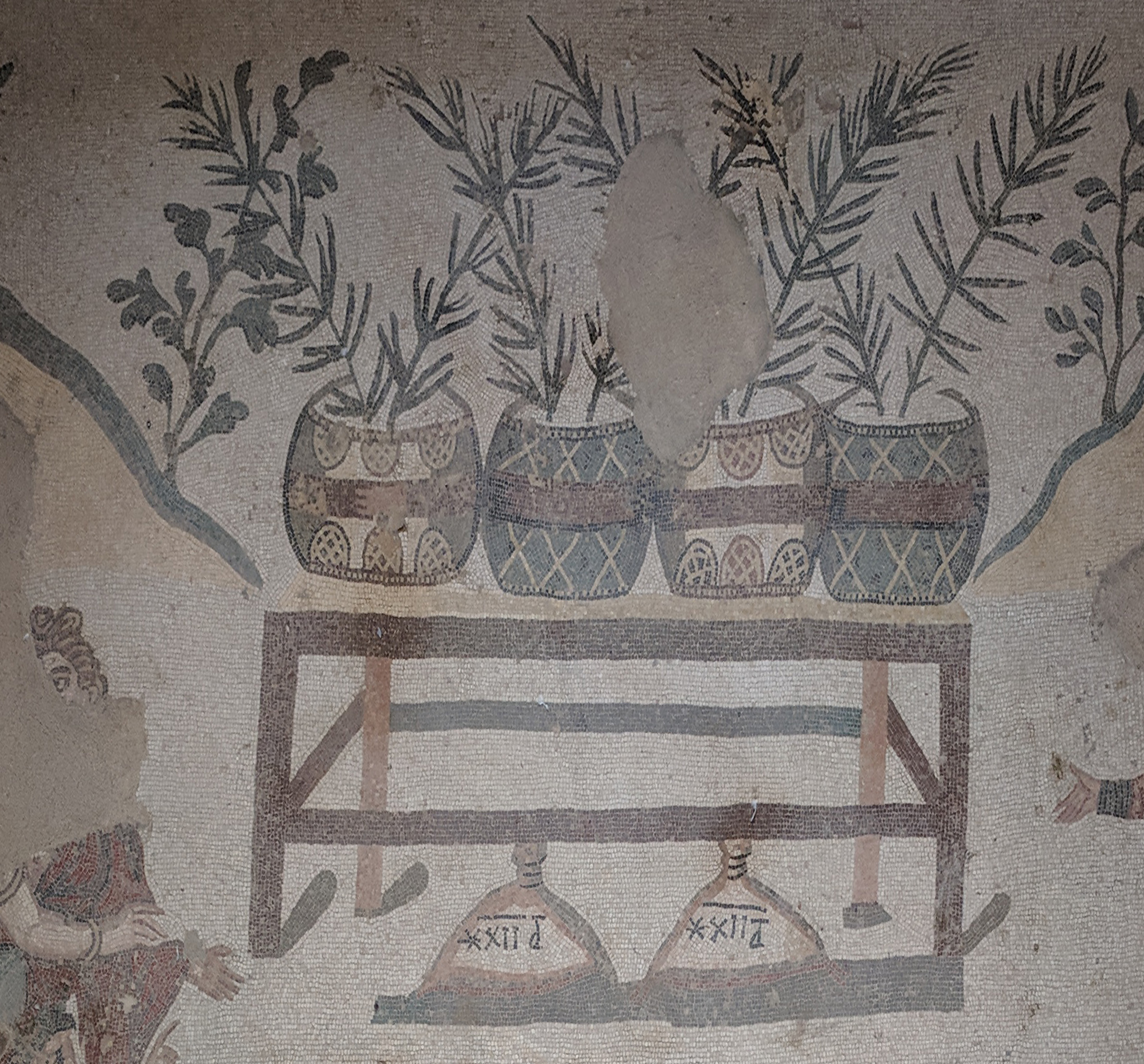 The bags of money are less common. Even more tantalizing is the writing on the bags. The line above multiplies the number by 1000. X with a horizontal line is regularly used as the symbol for the denarius on Diocletian’s price edict in both Latin and Greek versions and comes before the numeral. The edict is roughly the same date as the mosaics.