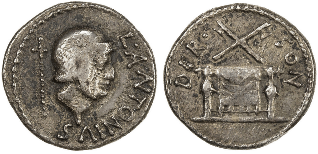L. Antonius quinarius with crossed fasces! and scepter! last auctioned 2020. I wonder what the DER SON was mean and the thing called an altar by the sales catalogue is a throne like that often shown with a thunderbolt. It is related to the iconography of the so-called pulvinar of Antonine coinages showing Commodus and his brother as infants enthroned (provincial, imperial).