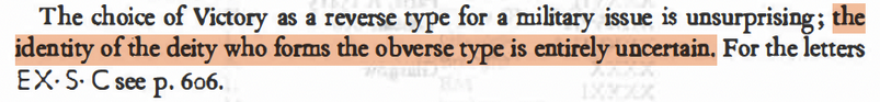 This is classic Crawford. Declare something impossible and erase all other speculation on the topic from our memory of this coin type. Babelon thought it was Anna Perenna and was followed in this interpretation by Grueber, Sydenham and Zehnacker. It is nonsense. Crawford is correct about that, but he could have told us that he was rejecting an established interpretation. Babelon says the same goddess appears on the coins of Turpilianus, but that is Feronia, turreted and labelled as such..There is a stylistic similarity to which I will return. Babelon completely ignored the attributes. He just wants the gens Annia to have patron goddess. Complete fantasy. Smyth in 1856 (p. 9) emphasized the scales and decided it must be Juno Moneta. Also I think unlikely. I find after writing most everything below and deciding to title this piece as I did, that I agree with Ekhel‘s first guess: “Caput anticae propter adstitutam plerumque bilancem vel Aequitatis est, vel Monetae.”. How I came to this conclusion is much of the rest of this blog post. According to Riccio the switch from Ekhel’s (v sensible guesses) to Anna Perenna started with Cavedoni, while Riccio is unreliable in some matters, I appreciate his willingness to confront the contradictions and make them transparent in this case to his reader. What I have not yet found is where Cavedoni said this. The following isn’t yet digitized as far as I can see: