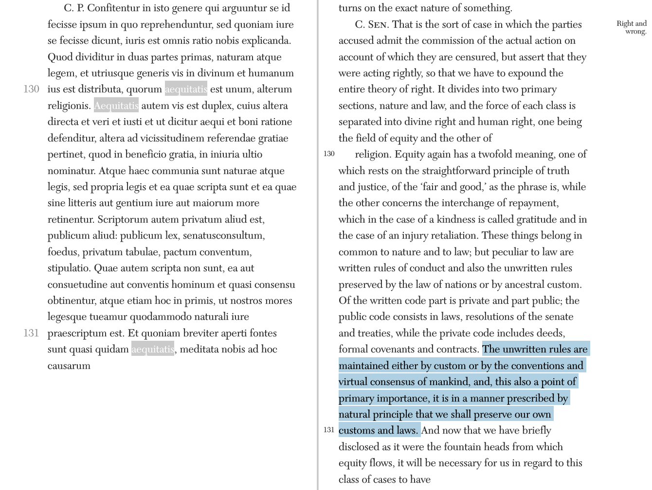 Cicero love the abstract concept of aequitas, but never seems to discuss it as divine; it is every where in his corpus. Both to praise individual morals and characterize public actions. Here he tries to define it: (De Partitione Oratoria 129-131):