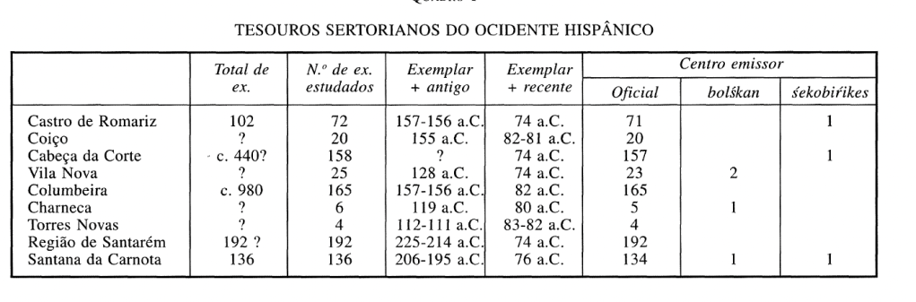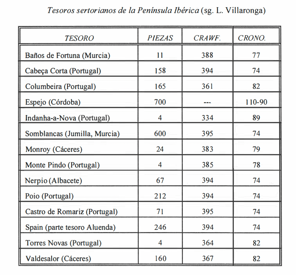 “The relative abundance of Sertorian hoards in this western strip of the Iberian Peninsula seems to show that this region played a quite important role, until recently unsuspected, in the final stage of the civil war between the populares and the aristocrats.” [machine translation]