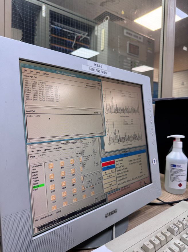 After setting up the experiment, we then monitored and controlled it from a room on the floor above. The key aspects of our work in the control room was setting the momentum and detune (basically weakening) of the beam, setting the solenoid necessary to achieve the momentum, and then monitoring and recording the data. This room had a window on to racks and racks of computer equipment all working at a fever pitch. Next to these racks was the very exciting Solenoid control unit which looked like something out of Star Trek (the original series) and perhaps almost as old. The dial for changing the numbers was analogue and the buttons made that satisfying physical click.