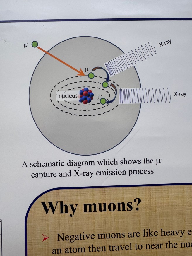 Let’s start with the science and we’ll see if I can explain it a wee bit. Muons are rapidly decaying subatomic particles that can be produced in a particle accelerator. On the beam line the muons come off before the electrons. We then direct these muons towards an object controlling their momentum. That momentum determines how far into the object the muons penetrate. When they penetrate they briefly enter the atoms in the target object.