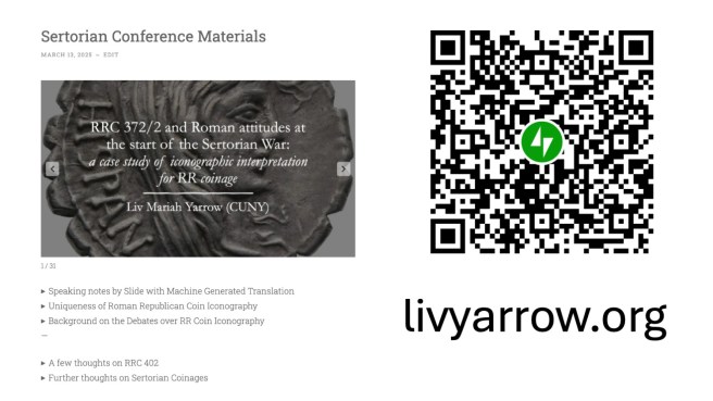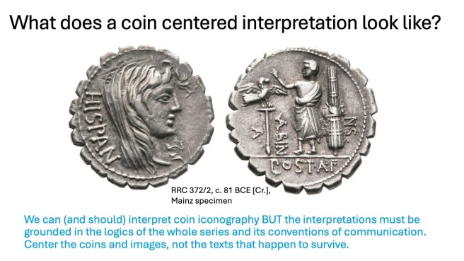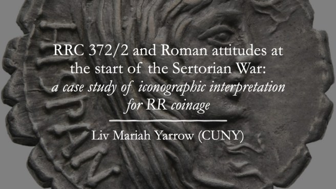 | RRC 372/2 and Roman attitudes at the start of the Sertorian War: A case study of iconographic interpretation for Roman Republican Coinage In the interests of time I am limiting myself to coinage produced by the Romans and will focus on a close reading of a single coin to demonstrate my approach this type of analyses. I’m exceptionally grateful to the generosity of organizers. I only wish I could have heard more papers. | RRC 372/2 y las actitudes romanas al inicio de la Guerra Sertoriana: Un estudio de caso de interpretación iconográfica para la moneda republicana romana En interés del tiempo, me limito a la moneda emitida por los romanos y me concentraré en una lectura detallada de una sola moneda para demostrar mi enfoque en este tipo de análisis. Estoy excepcionalmente agradecido por la generosidad de los organizadores. Solo desearía haber podido escuchar más ponencias. |