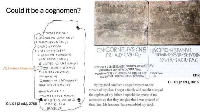 | Could it be a cognomen? Cognomina being with Hispan- are well attested, most famously among the Cornelii Scipiones, but also by sub elite families, hence my inclusion of a defixio dating probably for the decades just proceeding this coin. It is possible the obverse is evidence of a cognomen, but we have no supporting evidence of its use in the moneyer’s patrician gens and I don’t consider it particularly probable. | ¿Podría ser un cognomen? Los cognomina que comienzan con Hispan- están bien atestiguados, más famoso entre los Cornelii Scipiones, pero también por familias subélite, de ahí mi inclusión de una defixio que probablemente data de las décadas anteriores a esta moneda. Es posible que el anverso sea evidencia de un cognomen, pero no tenemos pruebas de su uso en la gens patricia del monetario y no lo considero particularmente probable. |