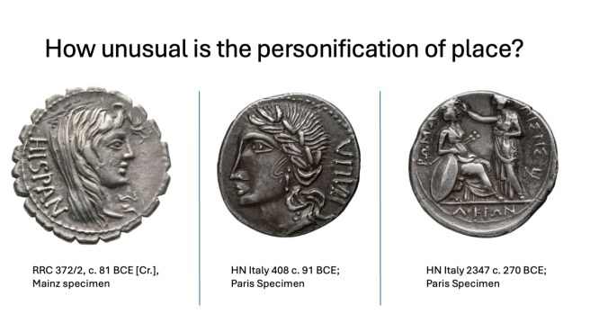 | How unusual is the personification of place? We have plenty of earlier examples of the personification of places on coins. Italia on the Social War coinage is the collective spirit of those allied against Rome. It is the first time such a collective identity under this name is conceived. Of course it echoes the personification of Roma herself on Roman coins. The Locrian coin shows Roma crowned by Pistis (fides) almost two centuries before our Hispania coin. I include it to show that foreign places can and did also appear on coins in Italy before this point. | ¿Qué tan inusual es la personificación de un lugar? Tenemos muchos ejemplos anteriores de la personificación de lugares en monedas. Italia en la moneda de la Guerra Social es el espíritu colectivo de aquellos aliados contra Roma. Es la primera vez que se concibe una identidad colectiva bajo este nombre. Por supuesto, hace eco de la personificación de Roma misma en las monedas romanas. La moneda de Locri muestra a Roma coronada por Pistis (fides) casi dos siglos antes de nuestra moneda de Hispania. La incluyo para mostrar que los lugares extranjeros también podían aparecer en las monedas en Italia antes de este punto. |