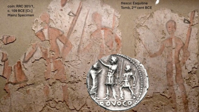 | [no slide title] Earlier precedents for standards in Roman art are hard to establish for all we seem to have some similar military banners depicted in Lucanian tomb painting. I’m not positive the little symbols in the top left of the left hand coin are really standards as identified by Crawford and others, but I have no better explanation of the type. More interesting to my mind is the use of a standard on a cistophoric coinage by the Cinnan commander and mutineer Fimbria in Asia Minor just 5 years earlier. Combined with the coins on the last slide it is suggestive a strong interest in symbols of power in this moment of intense civil strife. | [sin título de diapositiva] Es difícil establecer precedentes anteriores para los estandartes en el arte romano, aunque parece que tenemos algunos estandartes militares similares representados en las pinturas de tumbas lucanas. No estoy seguro de que los pequeños símbolos en la parte superior izquierda de la moneda de la izquierda sean realmente estandartes como los identificados por Crawford y otros, pero no tengo una mejor explicación del tipo. Más interesante para mí es el uso de un estandarte en una moneda cistofórica emitida por el comandante cínnano y amotinador Fimbria en Asia Menor solo cinco años antes. Combinado con las monedas en la última diapositiva, sugiere un fuerte interés en los símbolos de poder en este momento de intenso conflicto civil. |