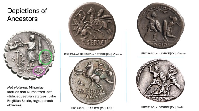 | Depictions of Ancestors The majority of ancestors on earlier coins are engaged in military heroics. In these representations the ancestors are dressed as soldiers not in the toga. In only about half the instances are we confident we know which specific ancestor is being honored, and thus we should not be surprised we are unsure about the figure on our own coin. | Representaciones de Ancestros La mayoría de los ancestros en las monedas anteriores están involucrados en heroicidades militares. En estas representaciones, los ancestros están vestidos como soldados, no con toga. En solo la mitad de los casos estamos seguros de saber qué ancestro específico se está honrando, por lo que no deberíamos sorprendernos de que estemos inseguros sobre la figura en nuestra propia moneda. |
