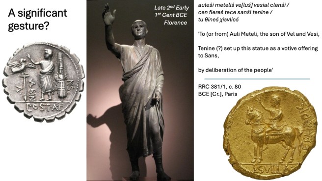 | A significant gesture? The final clue is the gesture of the togate figure. Our figure raises his arm in a manner reminiscent of the only slightly earlier Etruscan statue of Auli Meteli, often called the “Orator”. AND, perhaps more significantly, like the portrayal of Sulla’s equestrian statue on the nearly contemporary aureus. You can see by the head shape, hair and rendering of the toga, these two designs may even have been engraved by the same hand. It is hard for me to imagine the standing figure is meant to be Sulla himself, but it may be meant to recall a statue in Rome of one of the moneyer’s ancestors. | ¿Un gesto significativo? La última pista es el gesto de la figura con toga. Nuestra figura levanta su brazo de una manera que recuerda a la estatua etrusca ligeramente anterior de Aulo Metelio, a menudo llamada el “Orador”. Y, quizás más significativamente, como la representación de la estatua ecuestre de Sila en el aureus casi contemporáneo. Se puede ver por la forma de la cabeza, el cabello y la representación de la toga, que estos dos diseños pueden incluso haber sido grabados por la misma mano. Me cuesta imaginar que la figura de pie está destinada a ser el propio Sila, pero podría estar destinada a recordar una estatua en Roma de uno de los ancestros del monetario. |