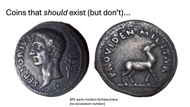 | Coins that should exist (but don’t) Both today and in early modern era there has been a great urge to connect our surviving texts with our surviving images, but we must allow for all we have lost and all we have yet to learn. I show an early modern ‘fantasy’ coin made for collectors who wanted a more ‘complete’ series of Roman republican coin. Similar fakes for other famous Romans also exist including Scipio and Cataline among others. | Monedas que deberían existir (pero no existen) Tanto hoy como en la era moderna temprana ha existido una gran urgencia por conectar nuestros textos supervivientes con nuestras imágenes sobrevivientes, pero debemos permitirnos aceptar todo lo que hemos perdido y todo lo que aún debemos aprender. Muestra una “fantasía” de la moneda moderna temprana hecha para coleccionistas que querían una serie más “completa” de monedas republicanas romanas. También existen falsificaciones similares de otros romanos famosos, incluidos Escipión y Catilina, entre otros. |