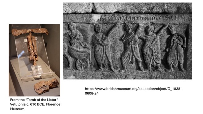 | [no slide title] Second century BCE representations of fasces, arguably the earliest we have from Rome, emphasis the use of the fasces by lictors rather than the tool as a stand alone symbol of imperium. | [sin título de diapositiva] Las representaciones de los fasces del siglo II a.C., probablemente las más antiguas que tenemos de Roma, enfatizan el uso de los fasces por los lictores en lugar de la herramienta como un símbolo independiente del imperium. |