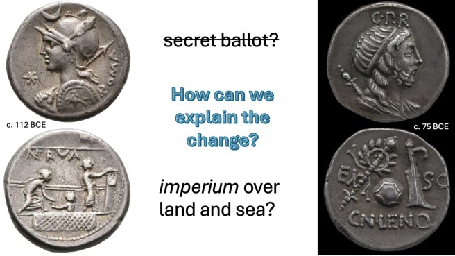 | How can we explain the change? Crawford and others suggested this design change was about elite competition, perhaps exacerbated by the introduction of the secret ballot. I argue that it is Mediterranean wide hegemony that leads to the instant recognizability of the denarius and allows for more diverse design choices. | ¿Cómo podemos explicar el cambio? Crawford y otros sugirieron que este cambio de diseño se debía a la competencia entre las élites, quizás exacerbada por la introducción del voto secreto. Yo argumento que es la hegemonía en todo el Mediterráneo lo que lleva al reconocimiento instantáneo del denario y permite elecciones de diseño más diversas. |