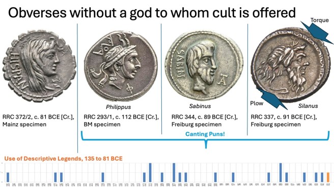 4) Mid 100s Roma stops being dominant obverse type, nearly vanishes after 89 BCE AND denomination markers also disappear