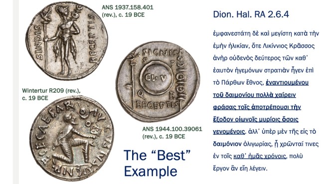 Slide 11: Why is Crassus safe? Dionysius’ choice of Crassus intersects with Augustus’ own intensive focus on the return of the Parthian standards as the symbol of his successful restoration of Roman power. The return is all over the coinage immediately after their return. Often associated with Mars Ultor and Augustus’ own Clipeus Virtutis which among other virtues celebrates particularly Augustus’ own piety.