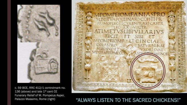 Slide 15: While it is hard to escape the Augustan rhetorical echo chamber, I think one way forward with this passage is to situate it along side other narratives of Roman defeats. Dionysius’ choice to center Crassus’ disregard for the omens as the cause of military disaster calls to mind another Roman disaster more commonly attributed to impiety, the battle of Drepanum in 249 BCE before which P. Claudius Pulcher allegedly tossed his sacred chickens overboard saying “if they will not eat, let them drink!”. The story is regularly used not only to explain how the Romans could possibly have lost but also as a morality tale about the importance of Roman religion and occasionally to illustrate the arrogance of the patricians or this particular gens. The drowning of the sacred chickens appears four times in Cicero, three times in later epitomes of Livy, as well as in Suetonius and Valerius Maximus. If the epitomes of Livy are true to his text, we have to imagine that this is a situation where Livy himself broke from Polybius as his primary source for events. Polybius is our oldest source for the battle, the narrative is complete, and there are no sacred chickens, alive or dead. Cicero never raises the episode in his surviving oratory, only in his philosophical treatises on Religion all composed under the Caesar’s dictatorship. I take from this that the episode was in common currency and ‘good to think with’ but not precisely something one could invoke in a republican political argument. Dionysius likely treated the battle of Drepanum in his late and now largely lost books. I’ve often thought if these survived in full instead of just the earlier more legendary books we might all have a v different option of Dionysius as a historian.
