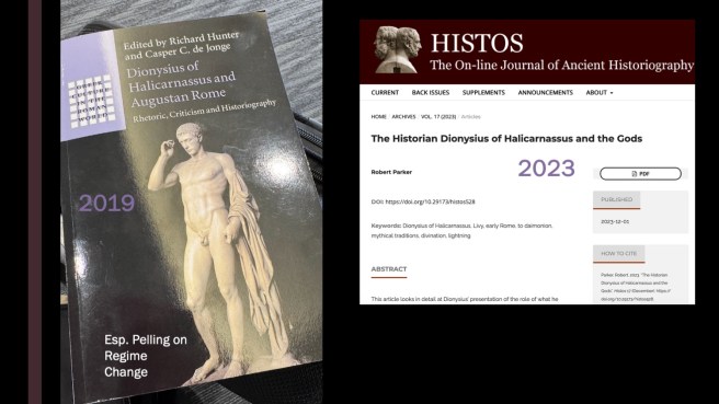 Slide 2: Yet, while I was trying to finish a pesky book on coins and clear the decks to get back to this type of historiographical question, other more dedicated minds were engaging with similar problems. I’ve particular admiration for Pelling on Regime Change and Parker on the Gods. I’m struck by how different is Pelling’s reading of Dionysius to my own. Not in care or intention or even in most conclusion, but rather the types of passages that interest us and seem most relevant for the question of Dionysius’ engagement with the contemporary. I was afraid I would have nothing left to say. [But of course we always do!]. Pelling begins with Dionysius’ distain for Polybius and ends by seeing Dionysius in a similar Augustan tradition as Livy and Vergil – not for or against but reflecting the Augustan age and its pre occupatons and dominant narratives.