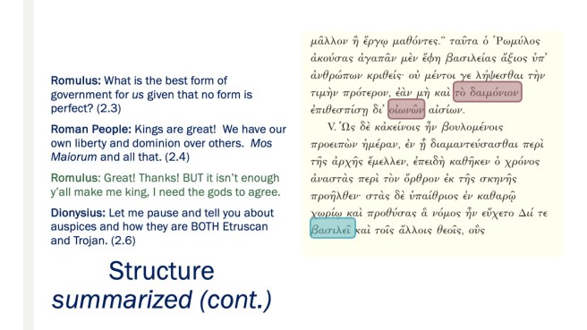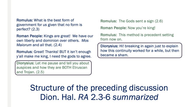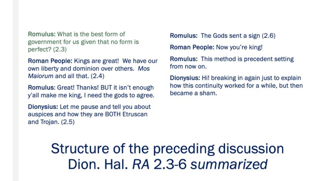 Slide 5: Chapter 2.4 opens with another reminder that the speech had been advised by Romulus’ grandfather. The people go off to confirm among themselves and they deliver this response. This is super strange. The people are not a deliberative body at Rome. They listen to speeches, elect candidates, and vote yes and no on legislation and guilty non-guilty in trials. Deliberation is the bailiwick of the Roman Senate not the populus. Even in the Senate the ‘debate’ follows a rigorously controlled speaking order. The speaker who replies for the unified whole is not named. He has no characterization at all. Dionysius again wants to present a pair of set speeches, He is most comfortable exploring abstract concepts in the rhetorical genre. Leaving this response to Romulus anonymous and communal allows him to formulate his own answer to his own question in his favorite style without engaging in characterization or further mythologizing. The answer is relatively short by comparison with Romulus’ framing of the ‘question’, just 13 lines of Greek in the Loeb printing compared to more than 60 for the set up. Only three main points are made clear: kingship is acceptable because of (1) the wisdom of the ancestors (2) it has provided freedom internally and dominion externally, and (3) Romulus himself is worthy by deeds and lineage. I take from this confirmation that Dionysius’ emphasis on Romulus’ grandfather is no accident, but rather further emphasis on deference to mos maiorum and filial piety.