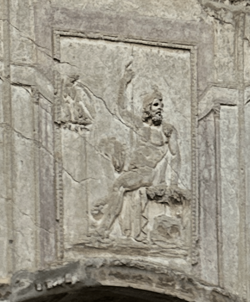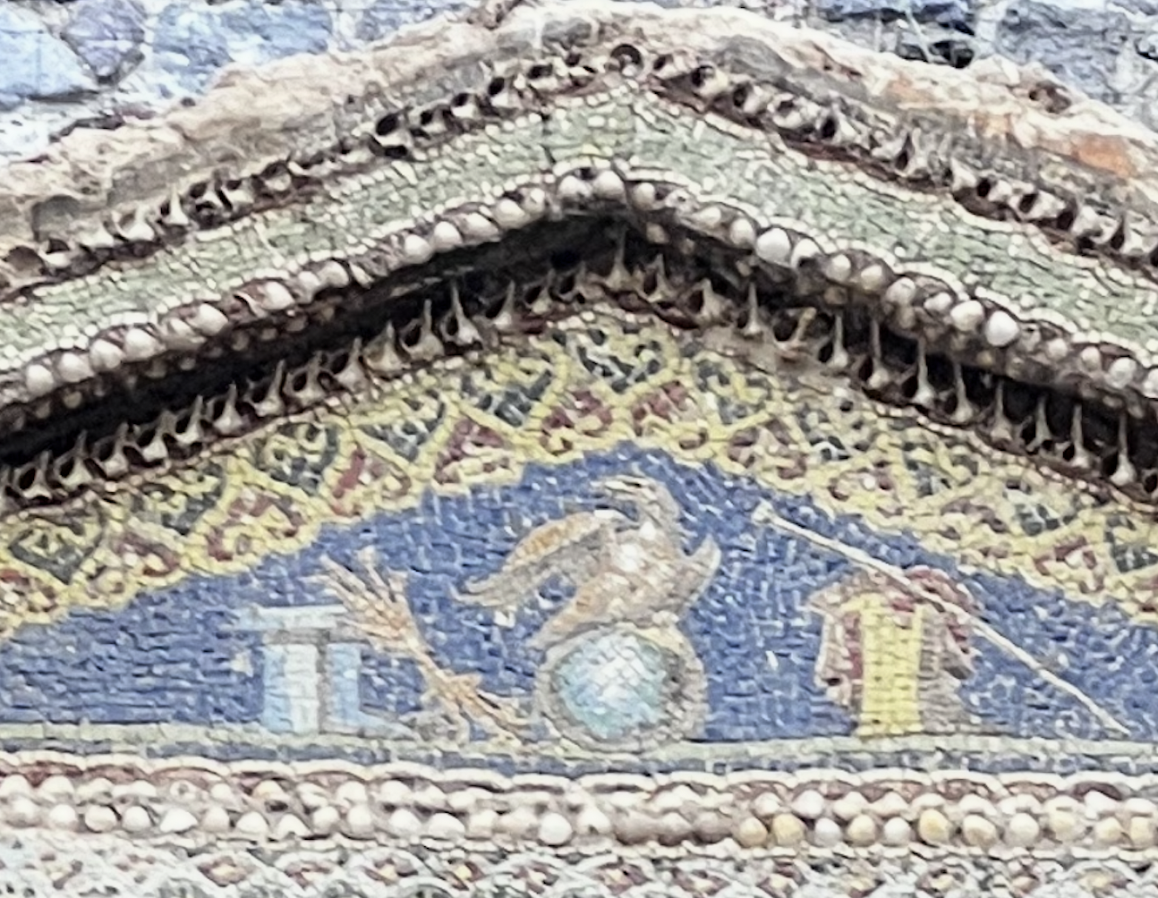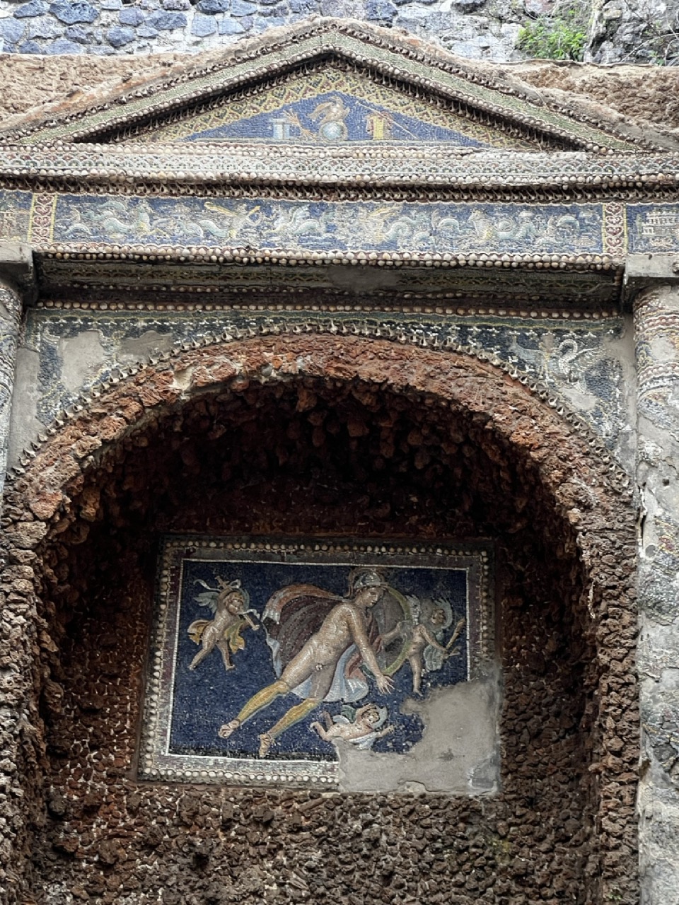 This mosaic from the Suburban baths is a nice teaching parallel for the Neptune Amphitrite mosaic from a domestic context in Herculaneum. The blue and shells are just the start. The central themes echo each other in male gods undone by desire. The cupids steal away Mars’ arms. Venus’ swans watch from the corners of the arch. Above this the freeze is more watery. Mermen engage with sea-griffins and just out of view we have the suggestion of architectural panels. I had a little conversation about the pediment yesterday on Bsky. We settled on altar and thunderbolt, eagle and globe, and cista with purple robe and scepter. I almost wonder if there might be a crown in that design. I’d need a better photo. Image the hands that collected the shells and sorted them and the artists who set each one to create this tapestry of color and texture and pattern.
