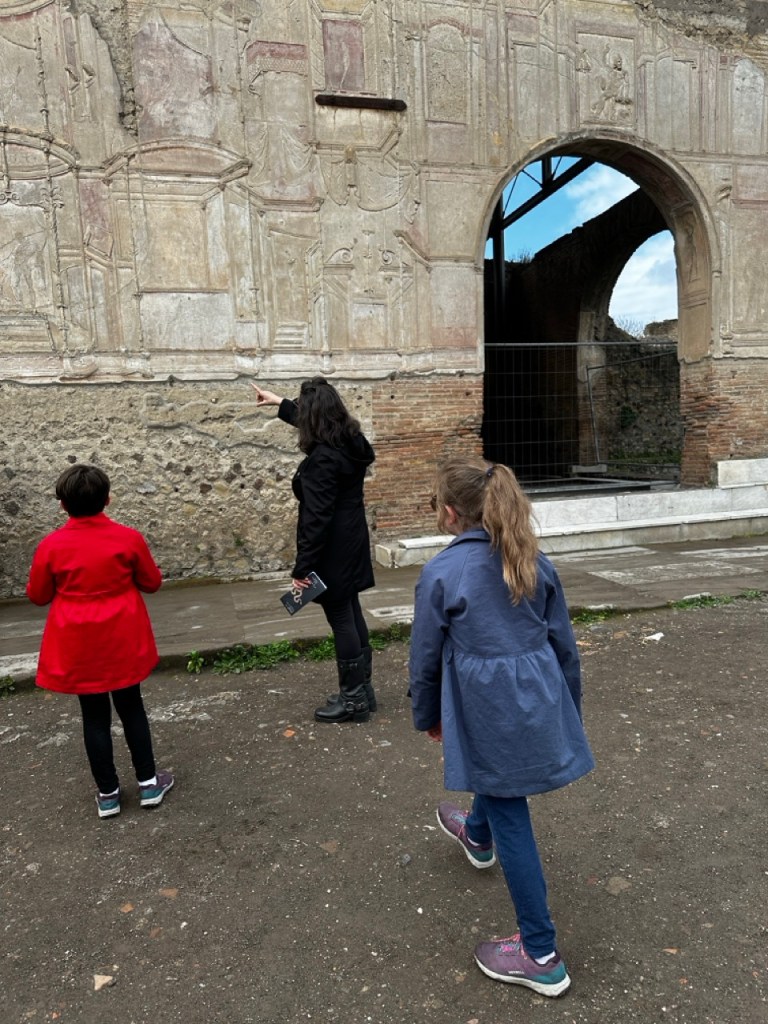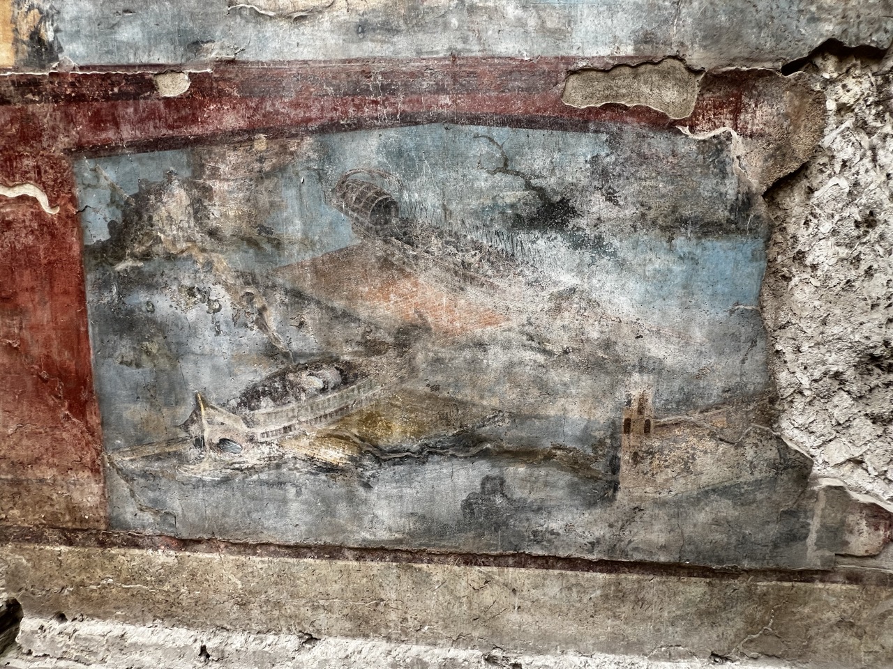 Here we’re in one of the urban baths. I like again for teaching the echoes of painting styles in plaster. Architectural fantasies are a common theme of domestic wall painting. Commonly I use as the primary teaching example the Boscoreale bedroom from the Met. It is good to show students these artistic esthetics cross the public/private divide and also different media. I also like the hints of pigment and how we must re color the environment for the original effect. I often talk to my students about the intensity of the Mediterranean sun and the quality of the light and how that changes the experience of color. I ask them to think about modern Caribbean esthetics and how that palette also plays with light and reflection off the water. It isn’t the same palette but the parallel helps them re conceptualize ancient art without defaulting to the polished white marble so beloved by the Victorians.