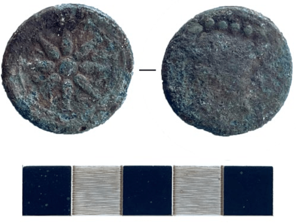 The stratigraphic sequence helps make sense of the recognition of activities. At the end of the sanctuary’s life, in the 1st century AD, the inscribed block RP 19 was still on the moulded base, along with another block to which it was connected by two iron clamps; the data does not tell us whether they still supported a crowning block. At some point, the clamps were broken, and a fragment of one ended up on the surface in front of the base, before the fall of block RP 19; presumably, it was only at this point that the upper block was dismantled. The coins, found on the edges of the base and covered by the abandonment layer, may have been uncovered during the dismantling of the blocks. If this hypothesis is accepted, they could be interpreted as objects deliberately placed between the blocks at the time of the base’s construction; otherwise, one must suppose that they were inserted into the joints during the ‘ritual’ life of the base, emerging by chance only after its dismantling.