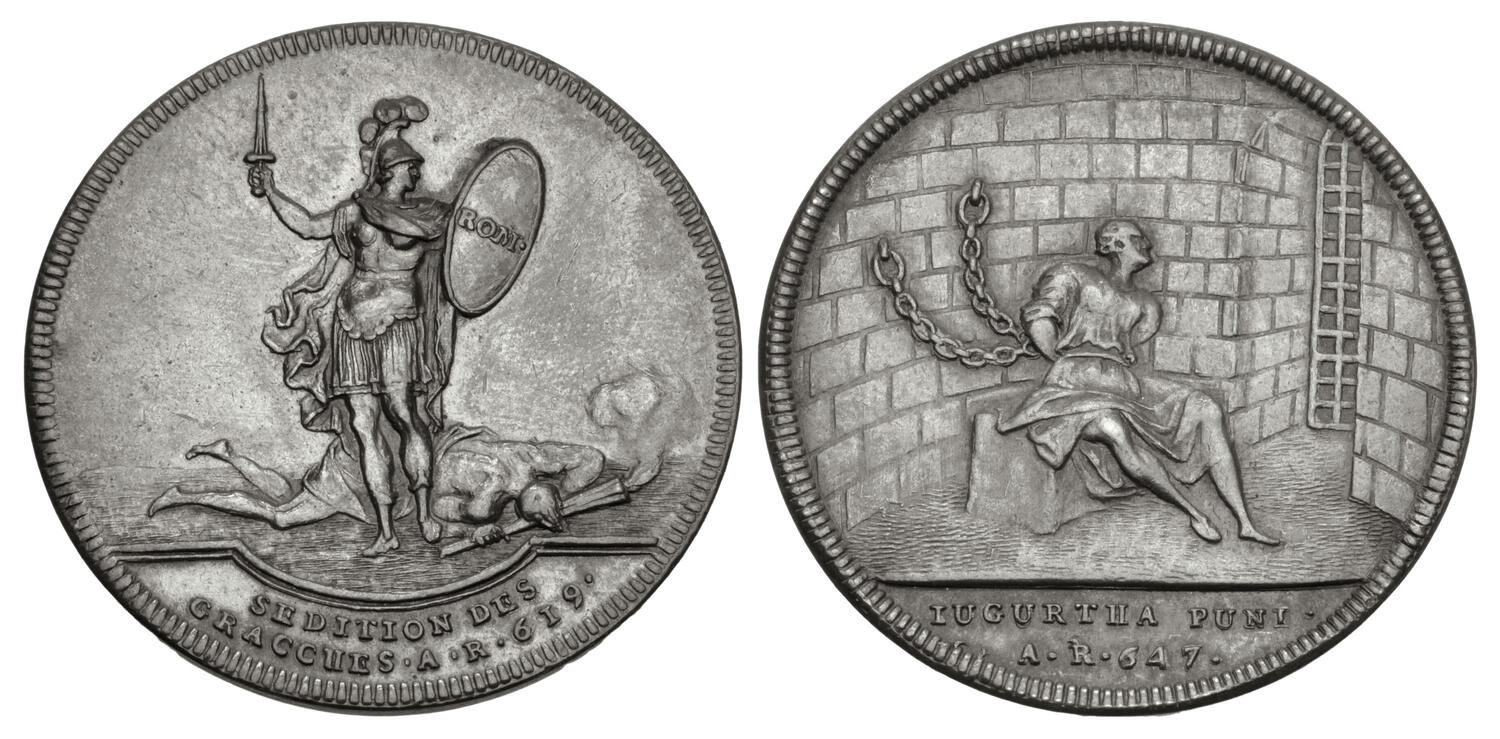 The Dassier medal didn’t surprise me. I’m a fan of their Roman historical medals series and own the catalogue of their medals, if not any of the medals themselves (books and plane tickets are my only true weaknesses). Jugurtha is a clean shaven prisoner chained to the wall of a stone prison with a barred metal door. That it is Jugurtha would be hard to deduce without the legend. If you’d ask me what it might represent without the text and I didn’t know the theme of the series, I’d probably have guessed Saint Paul imprisoned. I wondered if this was because I had some archetypal image in buried in mind from which this might be derived, but a quick google suggests not obviously so. I find something pathetic and sympathetic of the straining towards the door (light?) but am not at all confident the artist intended this. Overall I find the medal pro imperial. The Gracchi are described as seditious and the allegory of Rome is heroic and violent in her victory over them. The attribute of sedition seems to be a torch and the poverty evoked by the dress of the defeated man at Rome’s feet. The torch seems to be the implied threat to the city and its infrastructure through indiscriminate burning. Roma is also, of course, victorious over Jugurtha who is punished for resisting Roman authority over his kingdom. Both sides suggest a ‘resistance is futile’ message regarding the nature of Roman rule.